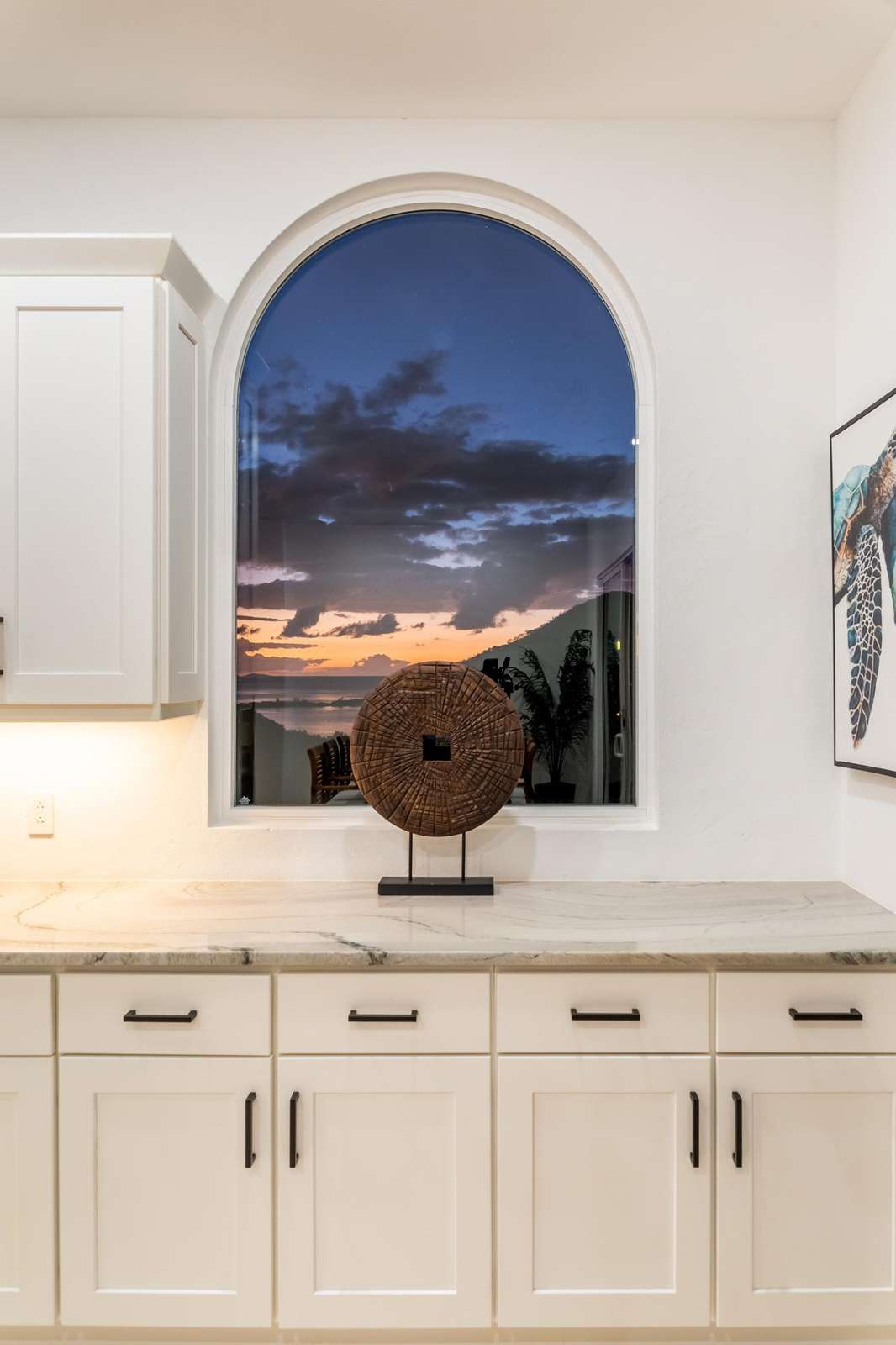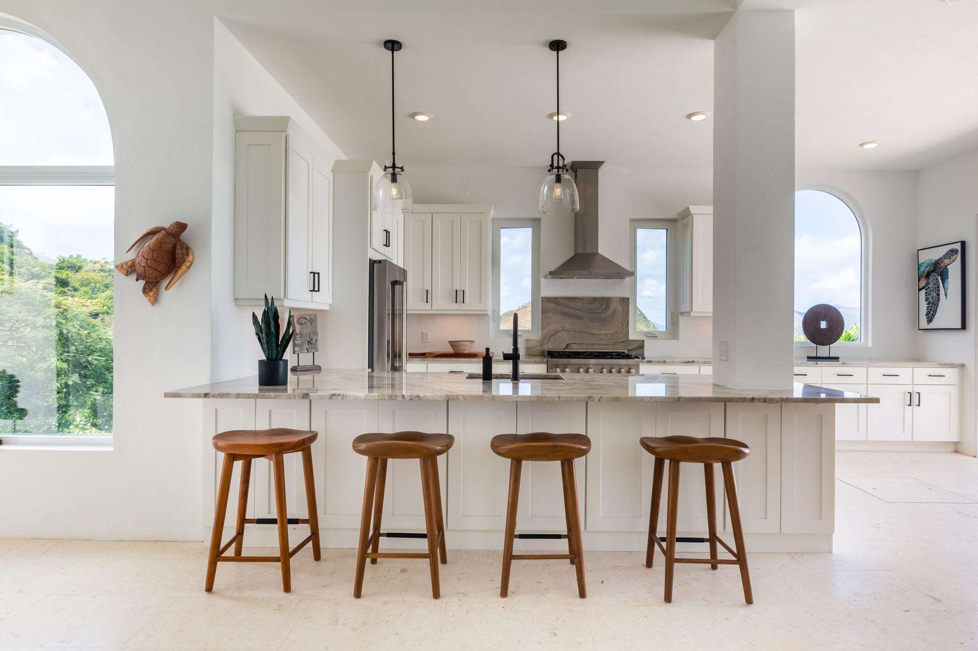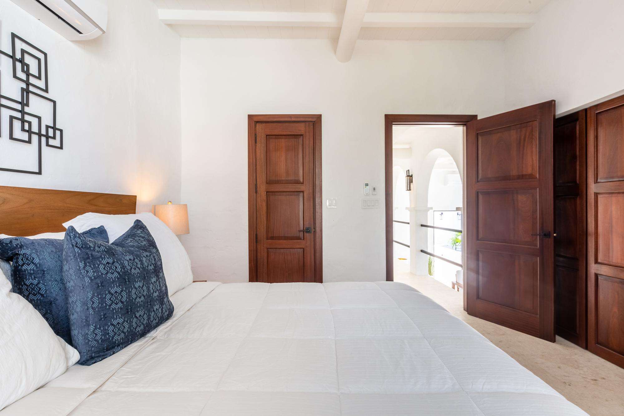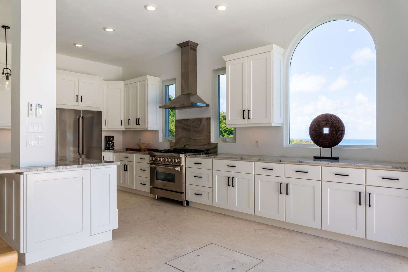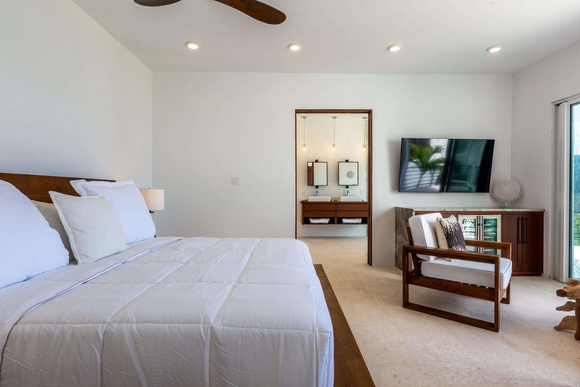 4) The Primary Suite is just spectacular. Another private paradise, it’s located in the 3rd bedroom a short stroll away from the main house. A very generous size, you’ll find the same luxurious amenities as the other bedrooms (King sized bed, AC , ceiling fans, large walk in closet, 65” flat-screen SmartTV) and a huge private porch with stunning ocean views – an idyllic spot for a morning coffee made with the drip-style coffee maker in your room. The ensuite bathroom is another work of art, with grand stone walk-in shower, bathtub, double vanity all of which is lit up by the soft light coming through a huge arched window framing the azure vistas.