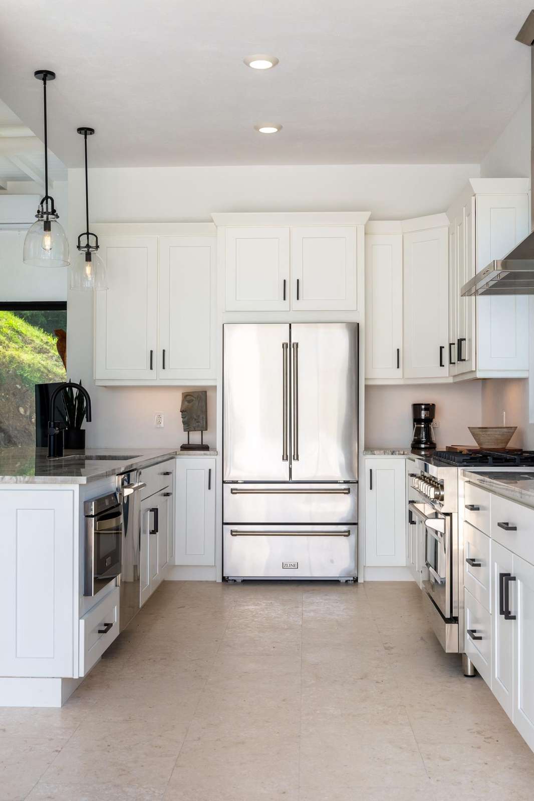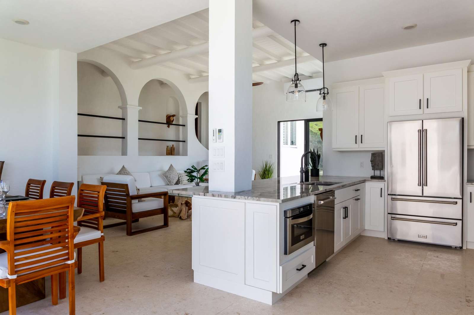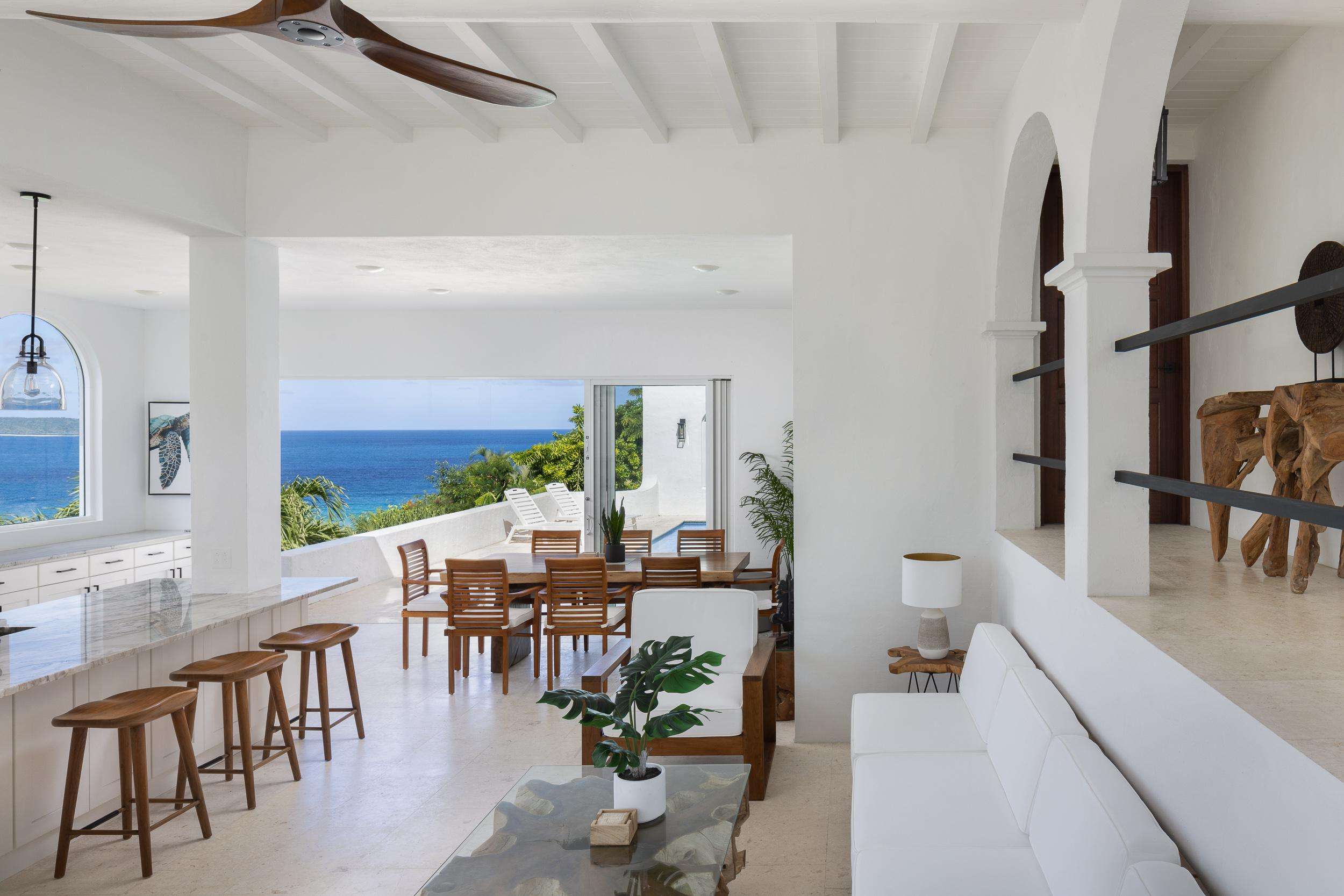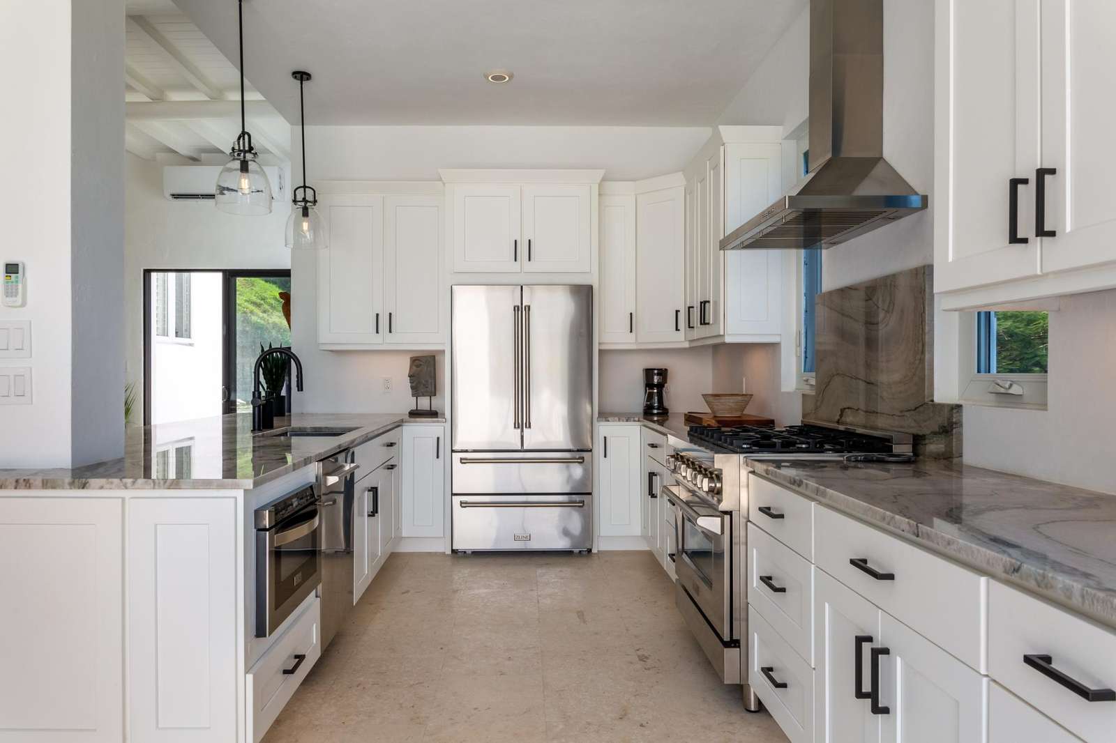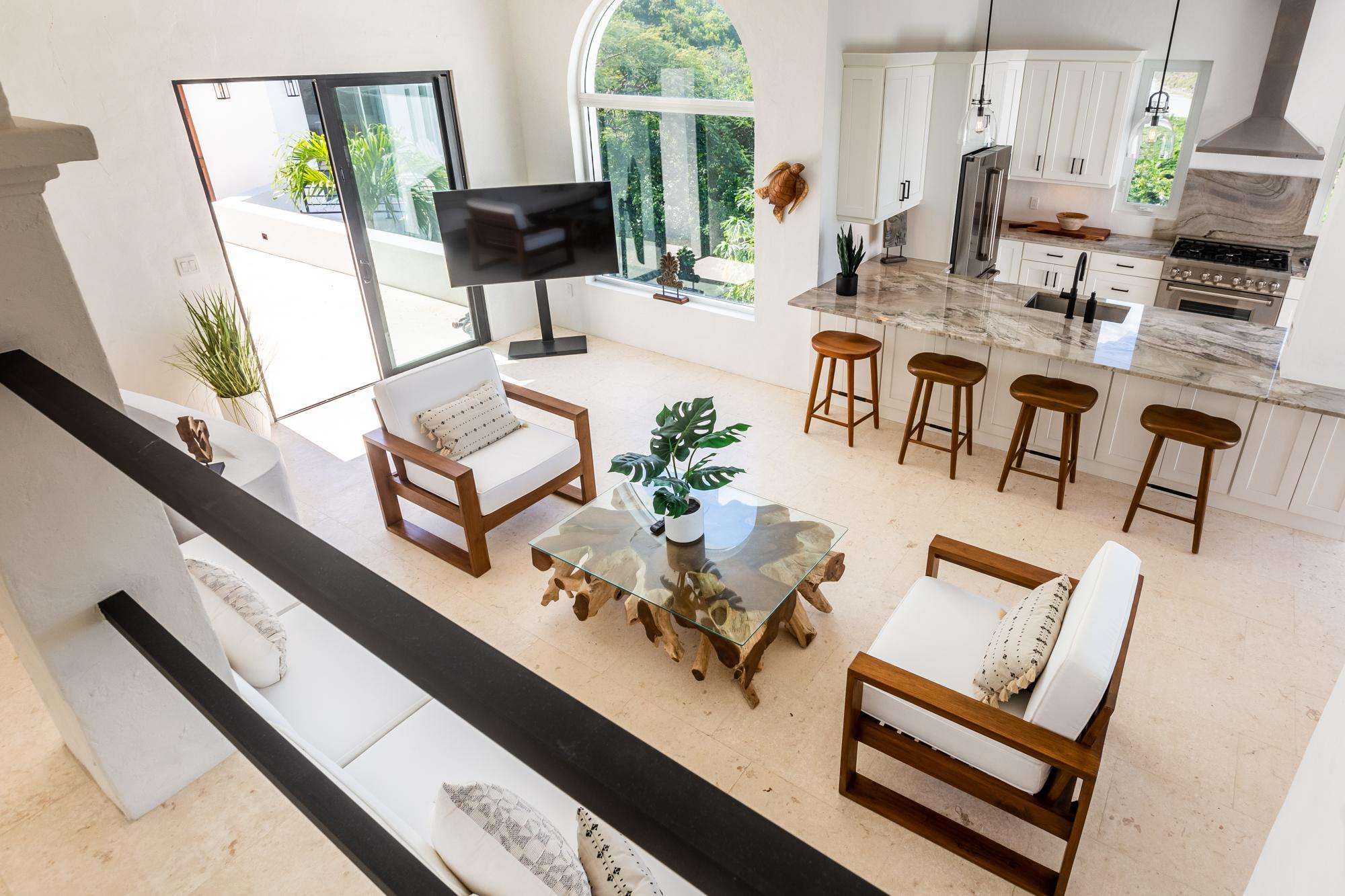 4) The Primary Suite is just spectacular. Another private paradise, it’s located in the 3rd bedroom a short stroll away from the main house. A very generous size, you’ll find the same luxurious amenities as the other bedrooms (King sized bed, AC , ceiling fans, large walk in closet, 65” flat-screen SmartTV) and a huge private porch with stunning ocean views – an idyllic spot for a morning coffee made with the drip-style coffee maker in your room. The ensuite bathroom is another work of art, with grand stone walk-in shower, bathtub, double vanity all of which is lit up by the soft light coming through a huge arched window framing the azure vistas.