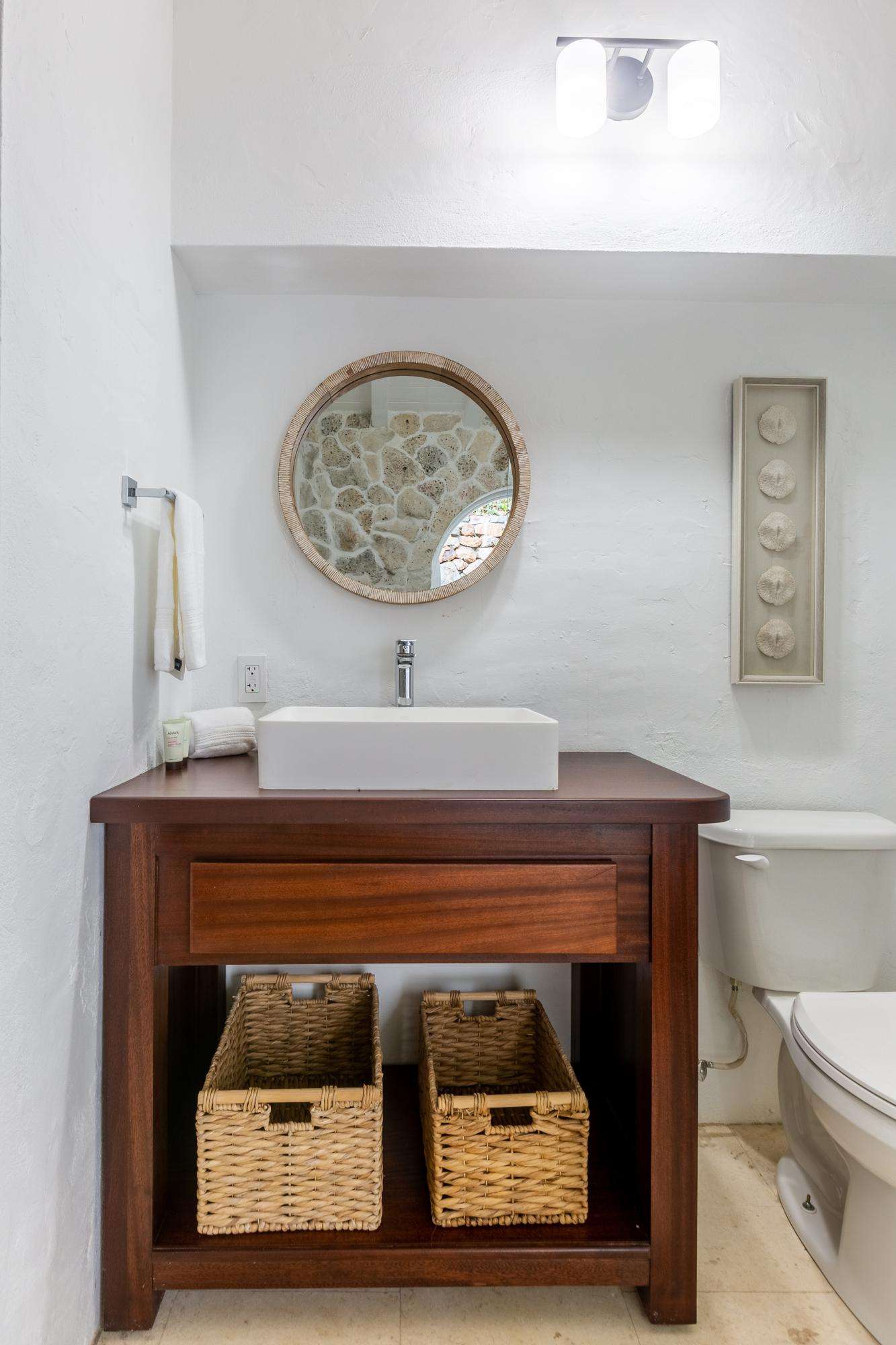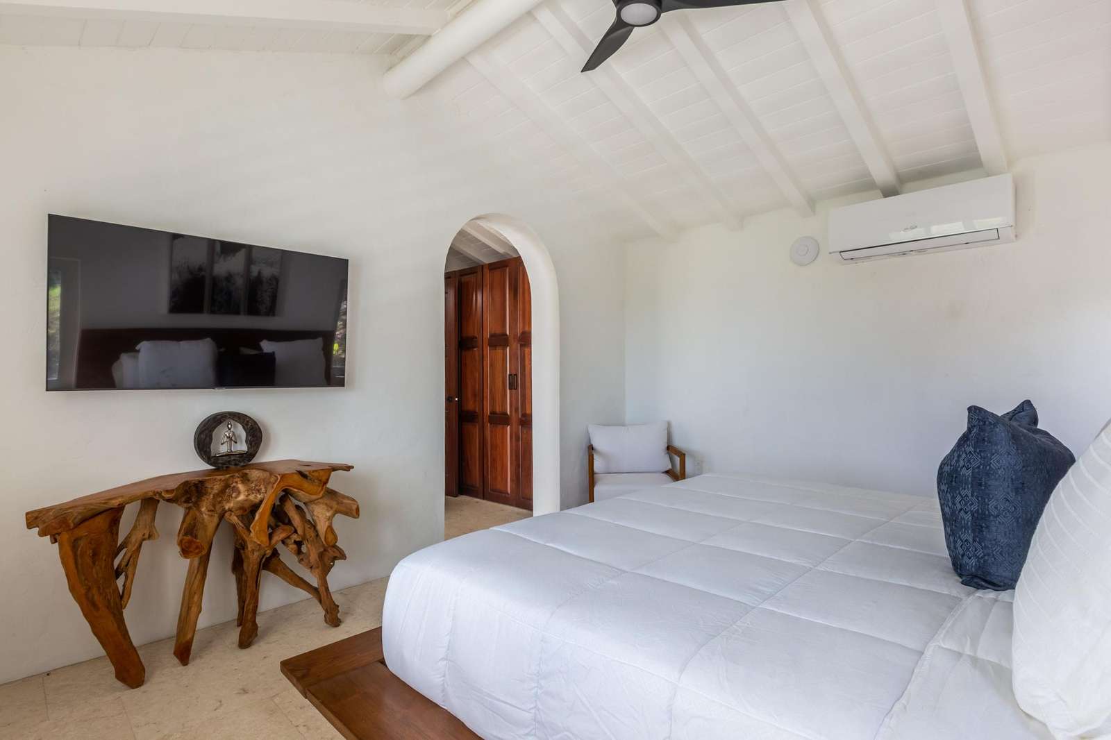 2&3) Bedrooms 2 & 3 can be found upstairs from the living room in the main house. Both have king sized beds, spacious built-in closets, 55” flat-screen SmartTVs & both AC & ceiling fans. They also both have their own ensuite bathrooms, with spacious walk-in showers & the cutest tropical addition of outdoor showers behind little arched doorways. One overlooks the pool & the other the ocean.
