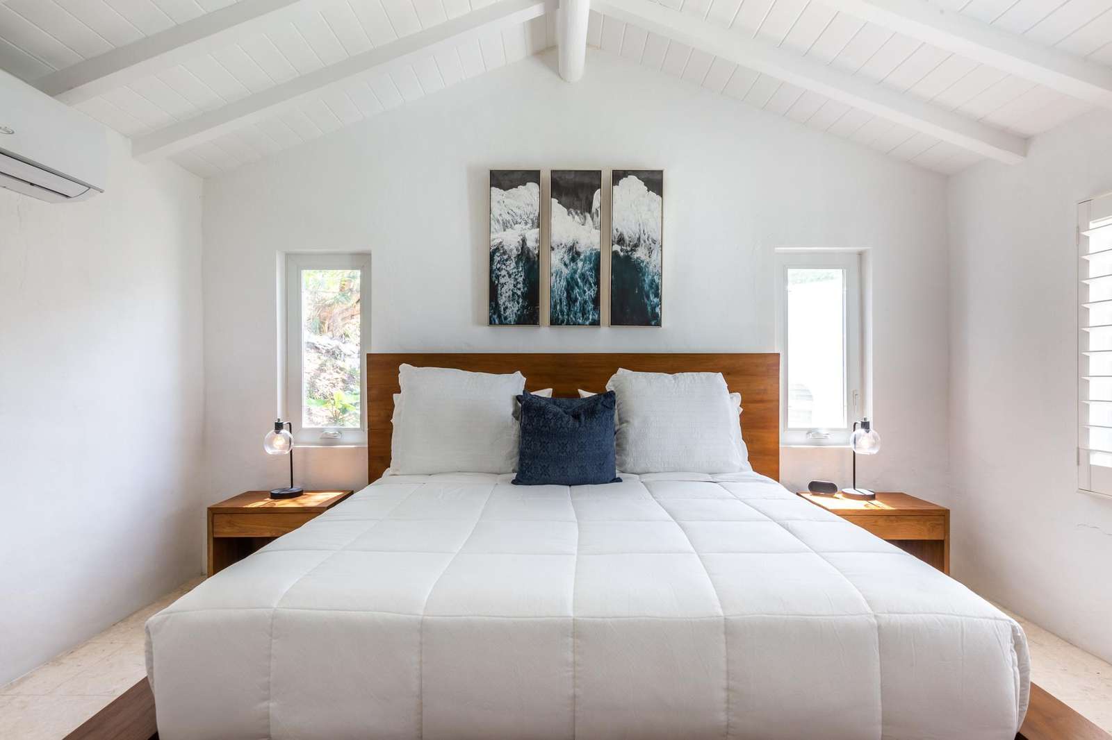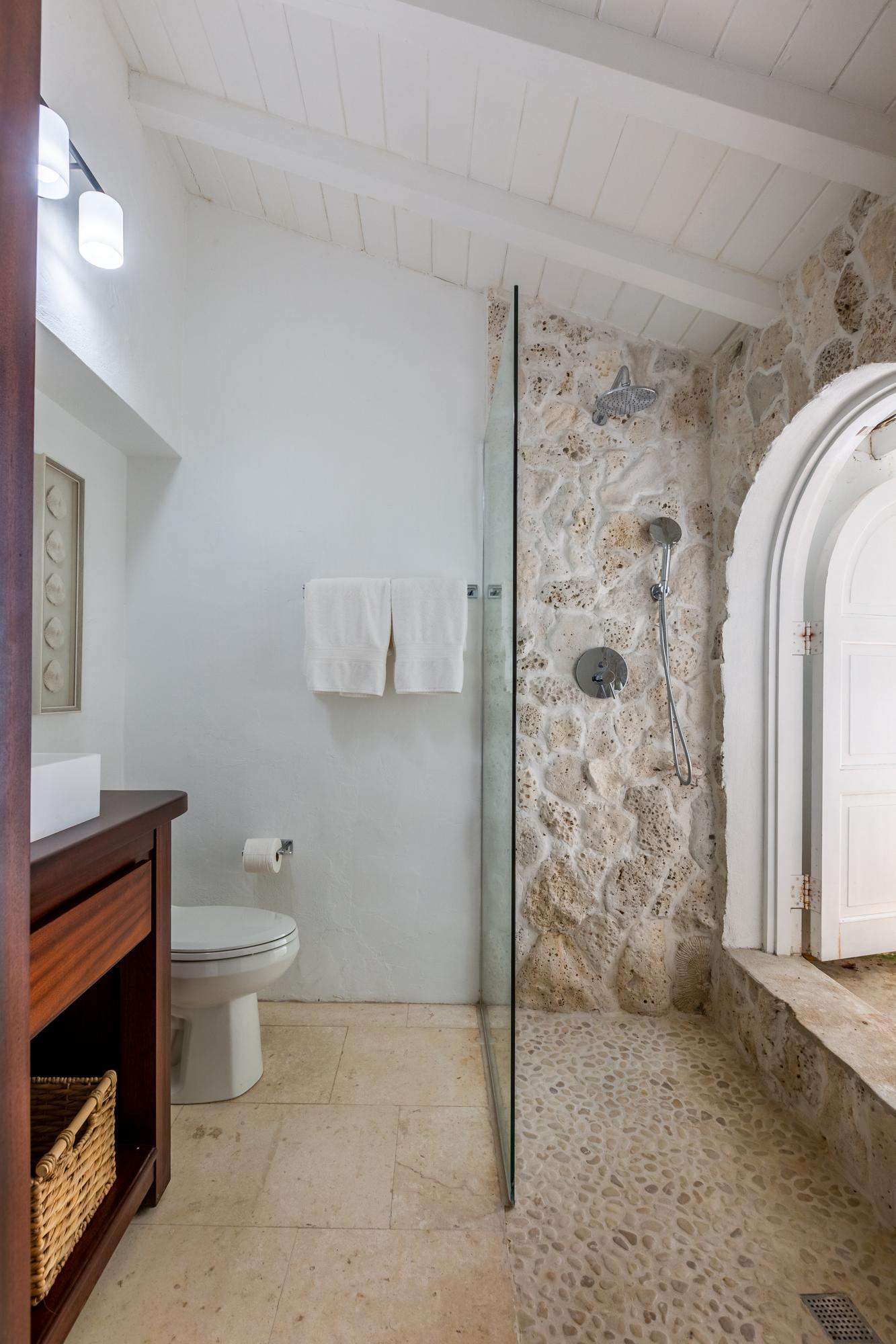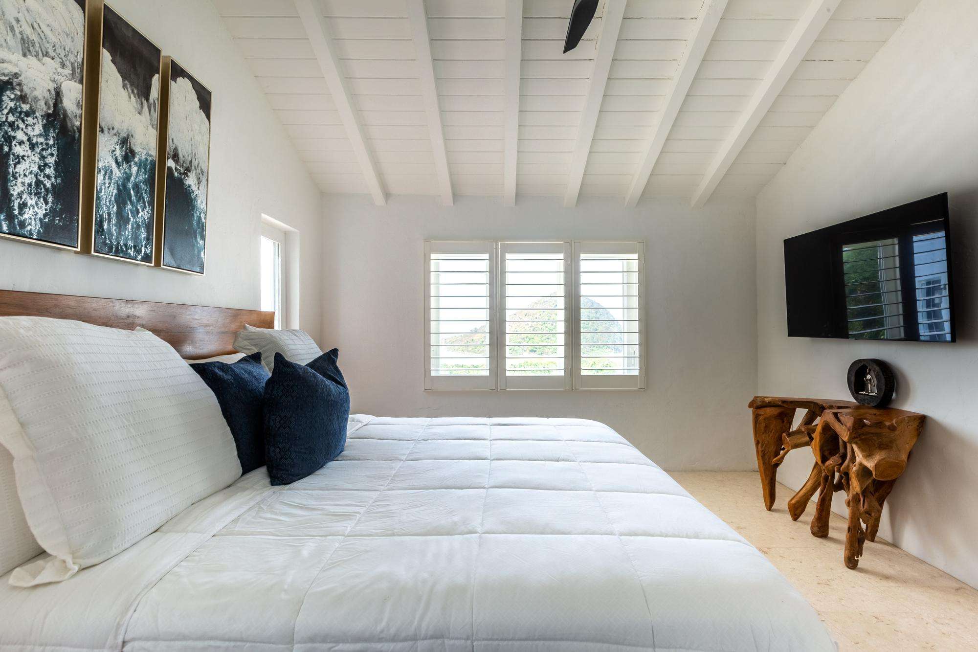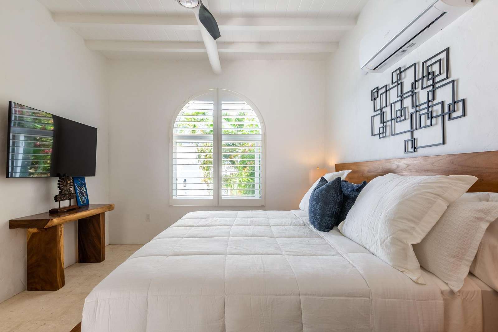 1) The 1st bedroom suite can be found in the first building, the other side of the pool terrace to the main house. A private sanctuary, you’ll find a king-sized bed, built-in closet, 55” flat-screen SmartTV, choice of AC or ceiling fan & stunning ocean views through the hurricane-shuttered arched windows. A truly gorgeous ensuite bathroom with a huge stone-lined walk-in shower awaits you to wash away the day. If all that isn’t enough, you’ll also be treated to a cute private porch overlooking Belmont Pond & Long Bay Beach.
