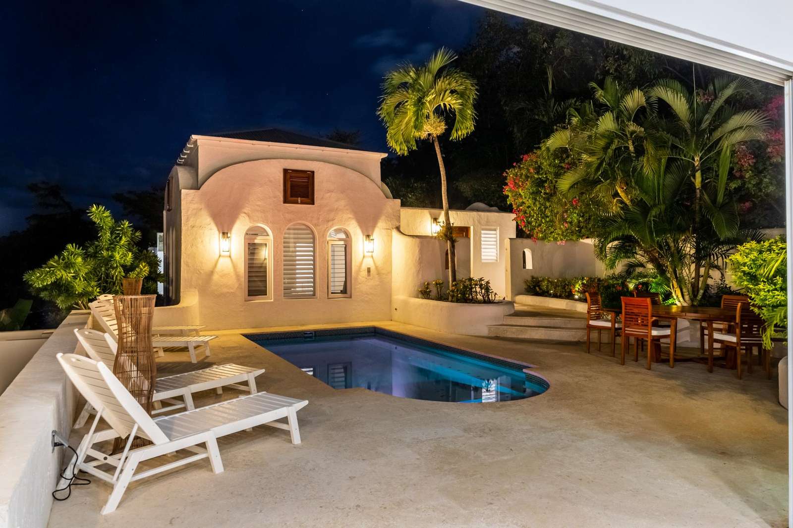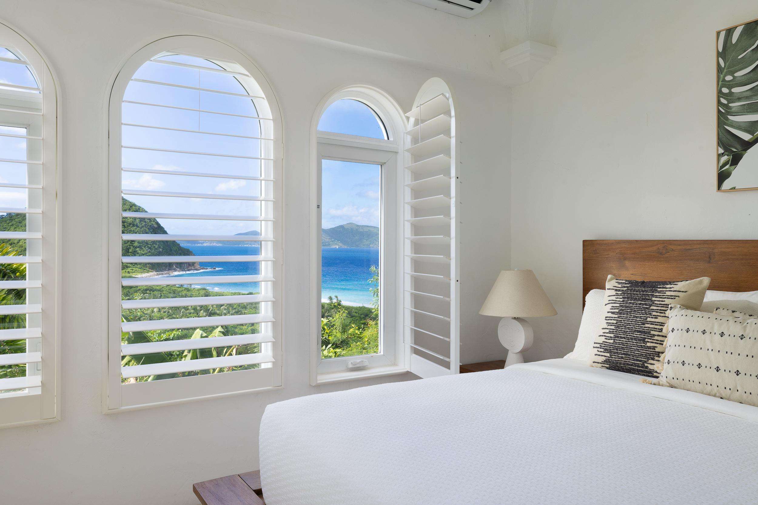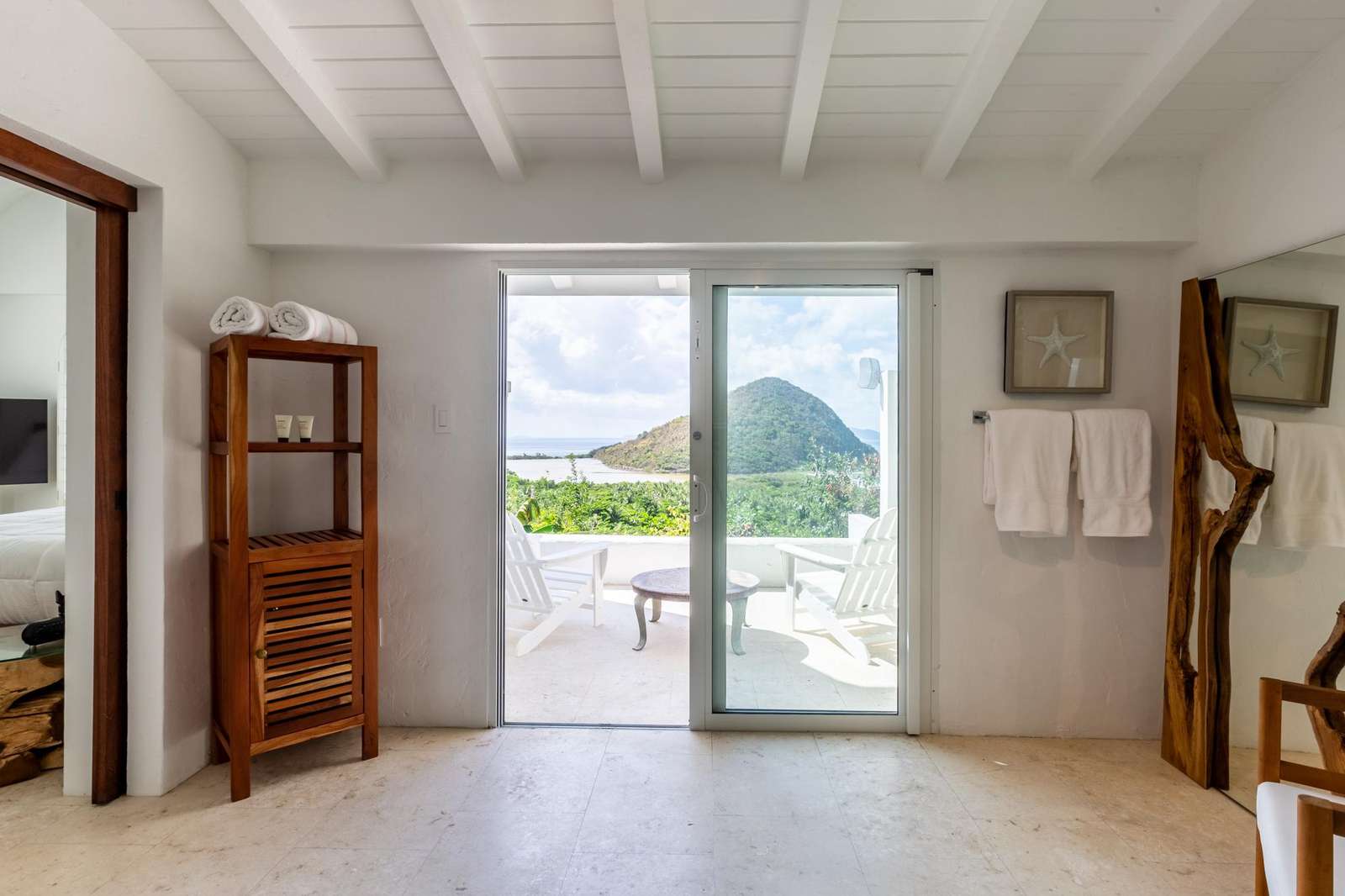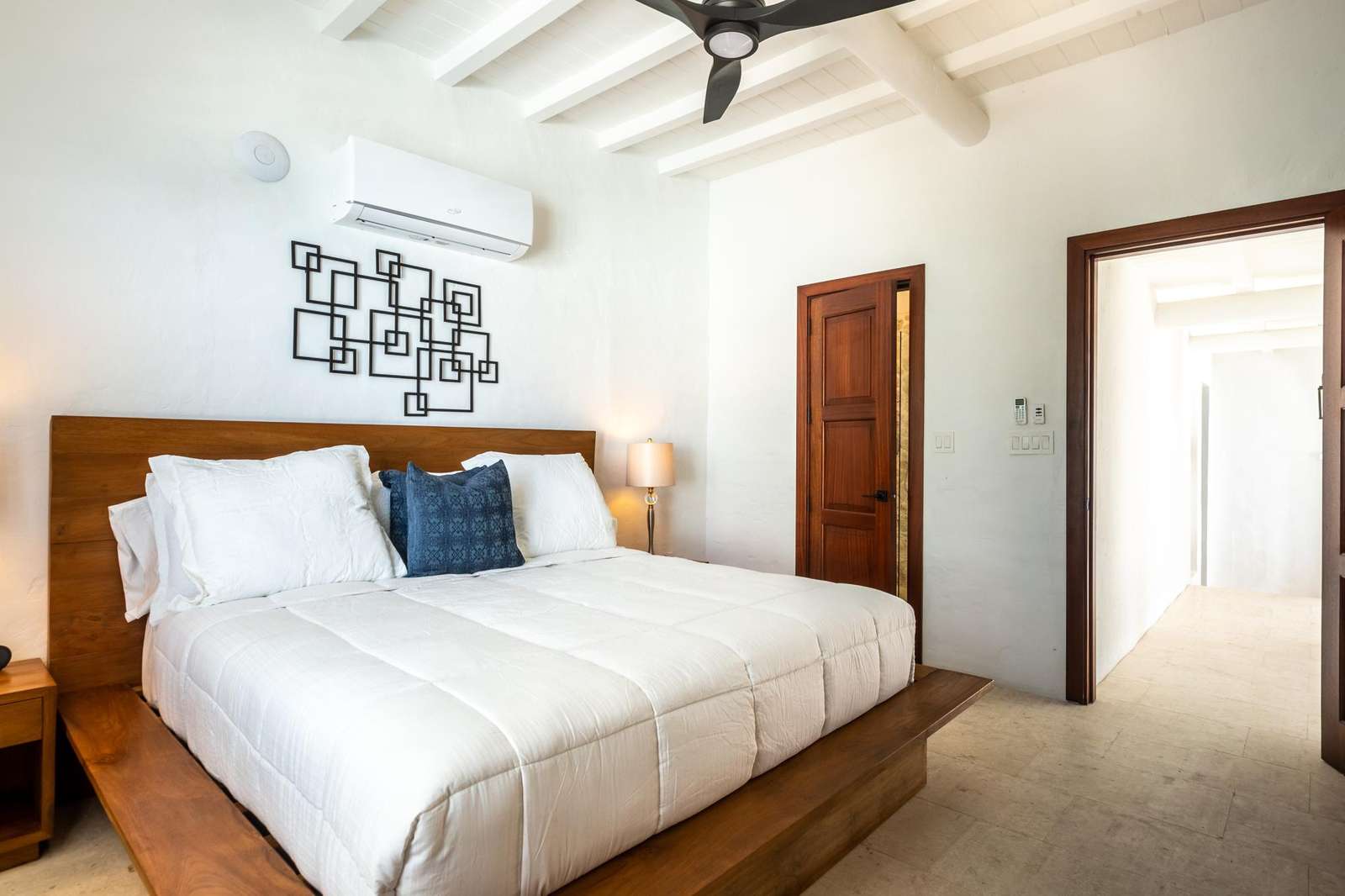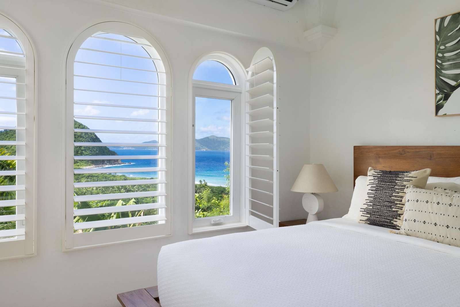 1) The 1st bedroom suite can be found in the first building, the other side of the pool terrace to the main house. A private sanctuary, you’ll find a king-sized bed, built-in closet, 55” flat-screen SmartTV, choice of AC or ceiling fan & stunning ocean views through the hurricane-shuttered arched windows. A truly gorgeous ensuite bathroom with a huge stone-lined walk-in shower awaits you to wash away the day. If all that isn’t enough, you’ll also be treated to a cute private porch overlooking Belmont Pond & Long Bay Beach.