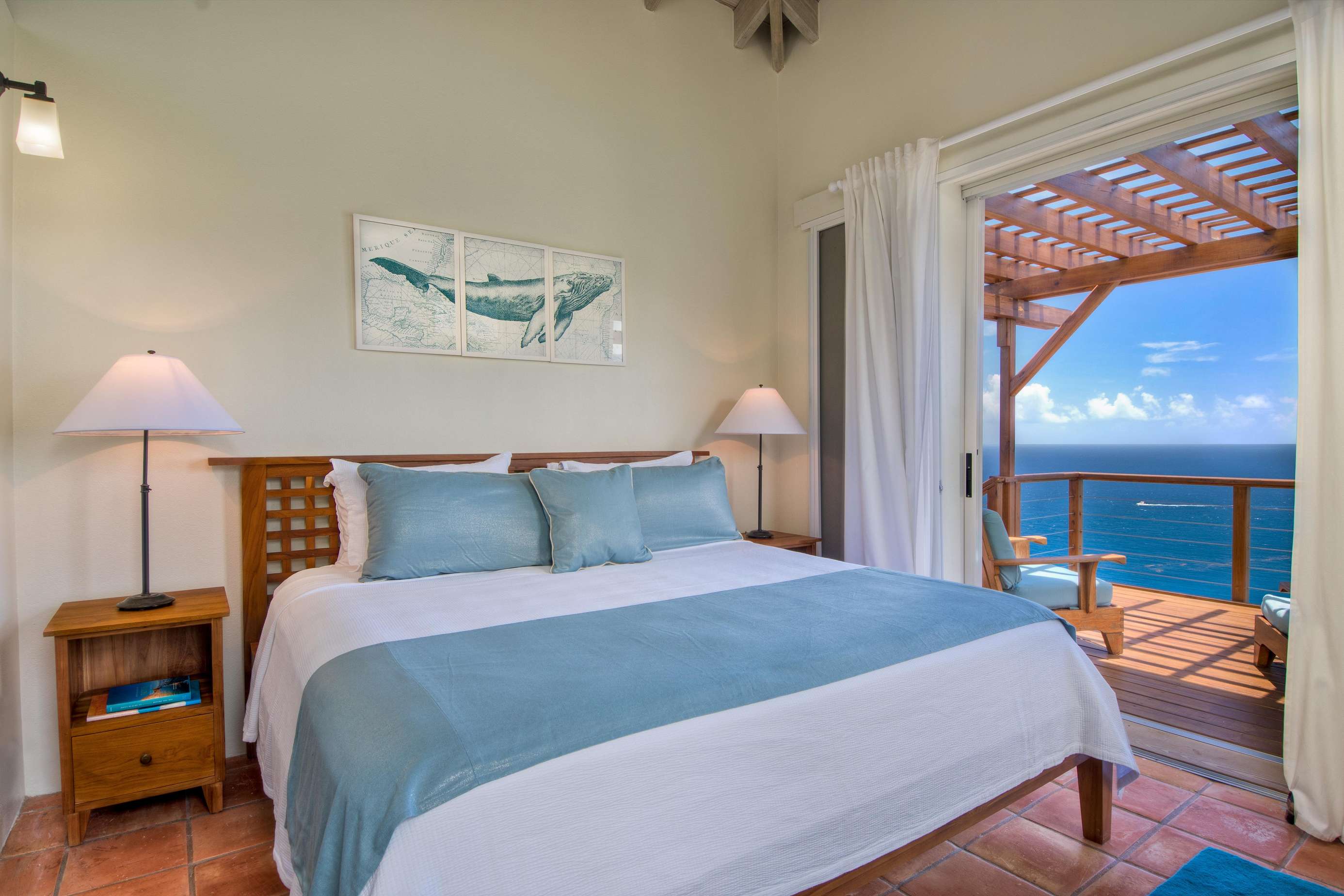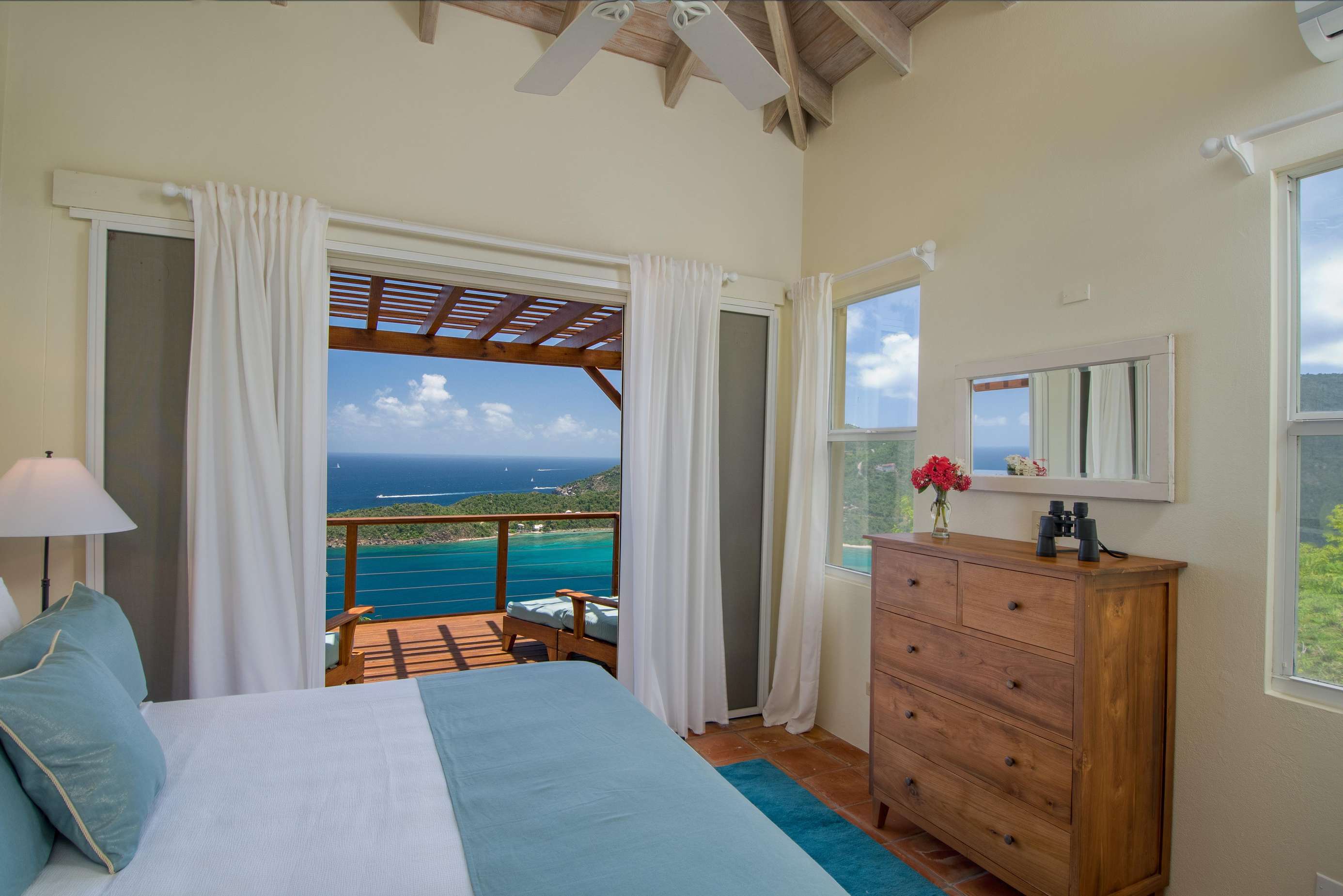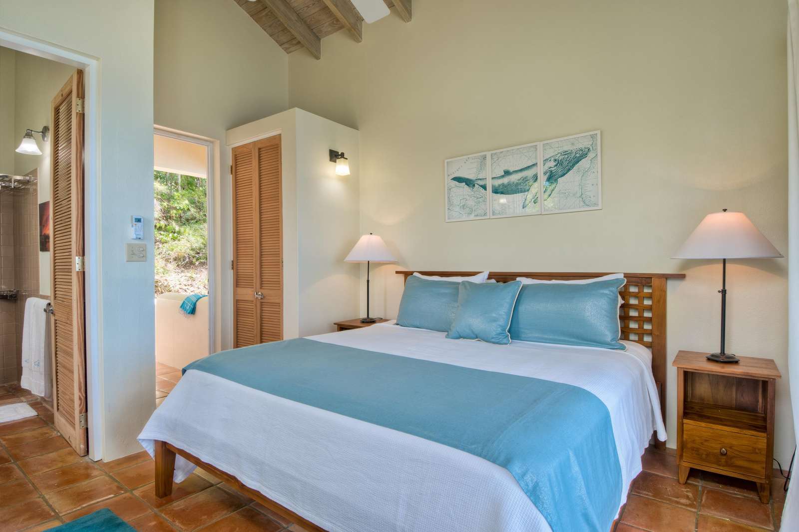1)The Primary bedroom is a few steps up from the main level front door and features a king bed with matching custom-built teak bedroom set, AC, an ensuite bathroom with shower and of course, unbelievable views. The glass sliding doors lead out onto a personal balcony overlooking the pool and the bay below. This is a truly magical spot to enjoy a morning coffee whilst watching the miles of glistening ocean ripples.