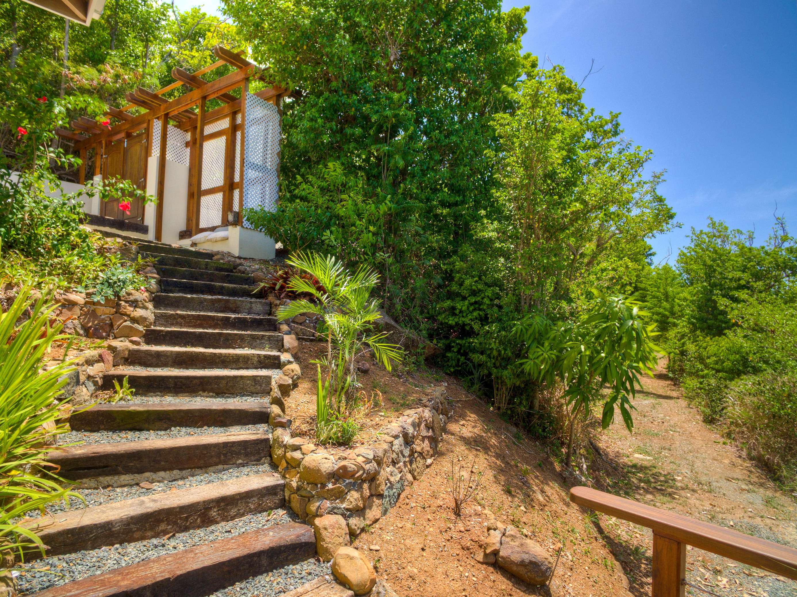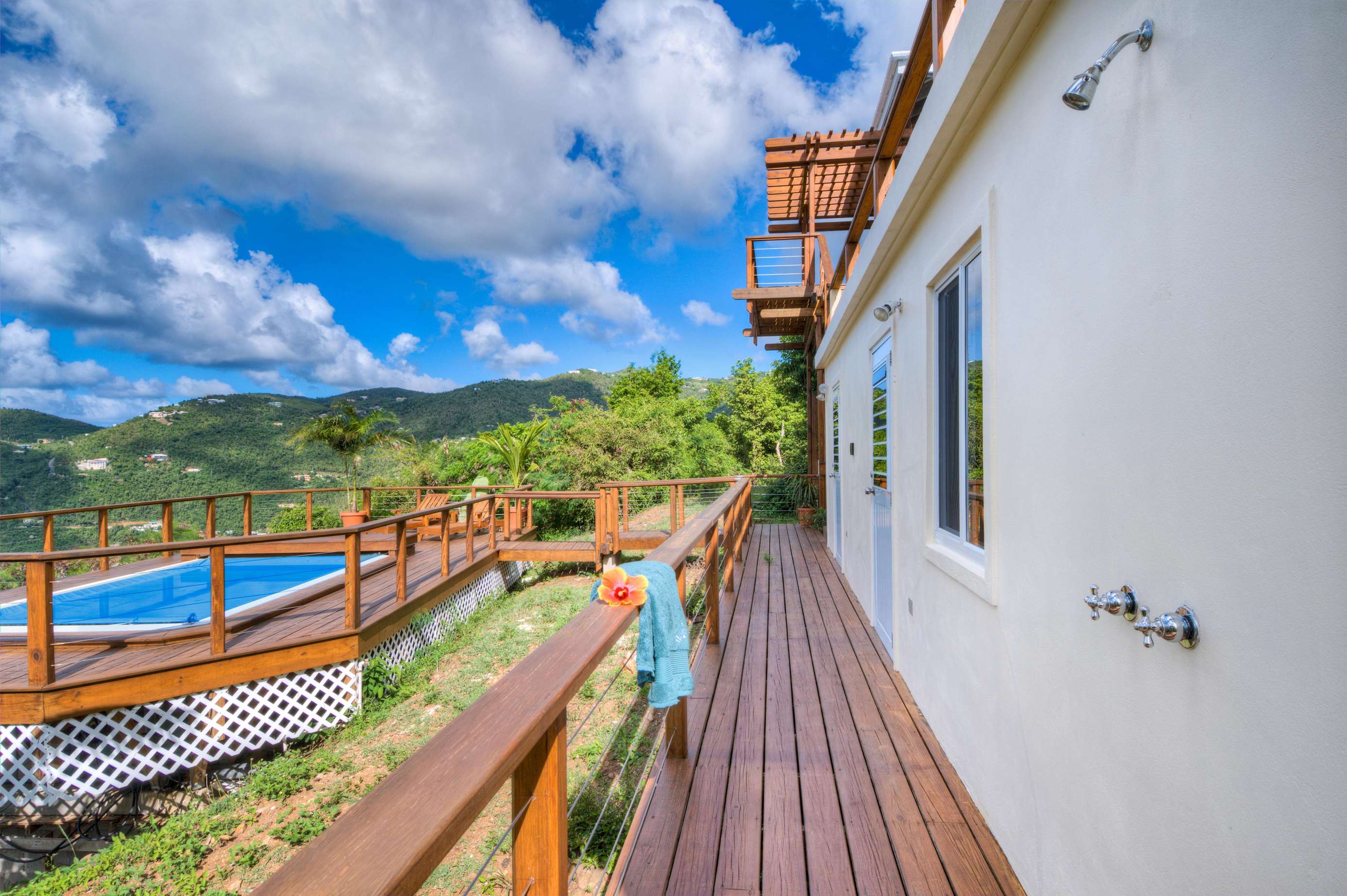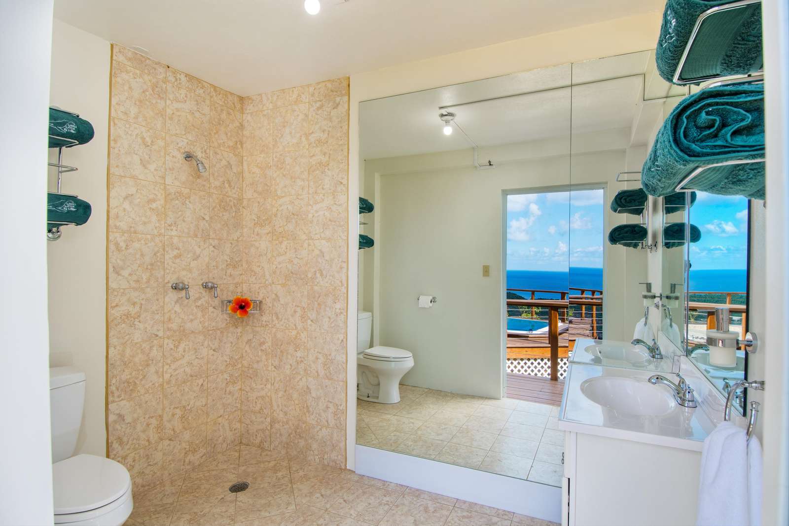 1)The Primary bedroom is a few steps up from the main level front door and features a king bed with matching custom-built teak bedroom set, AC, an ensuite bathroom with shower and of course, unbelievable views. The glass sliding doors lead out onto a personal balcony overlooking the pool and the bay below. This is a truly magical spot to enjoy a morning coffee whilst watching the miles of glistening ocean ripples.