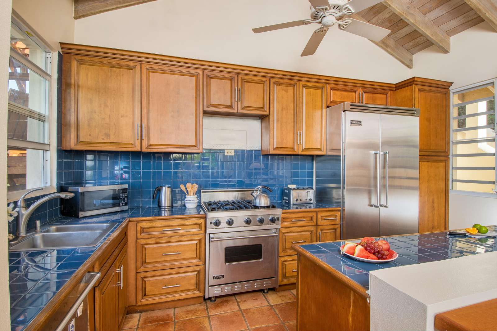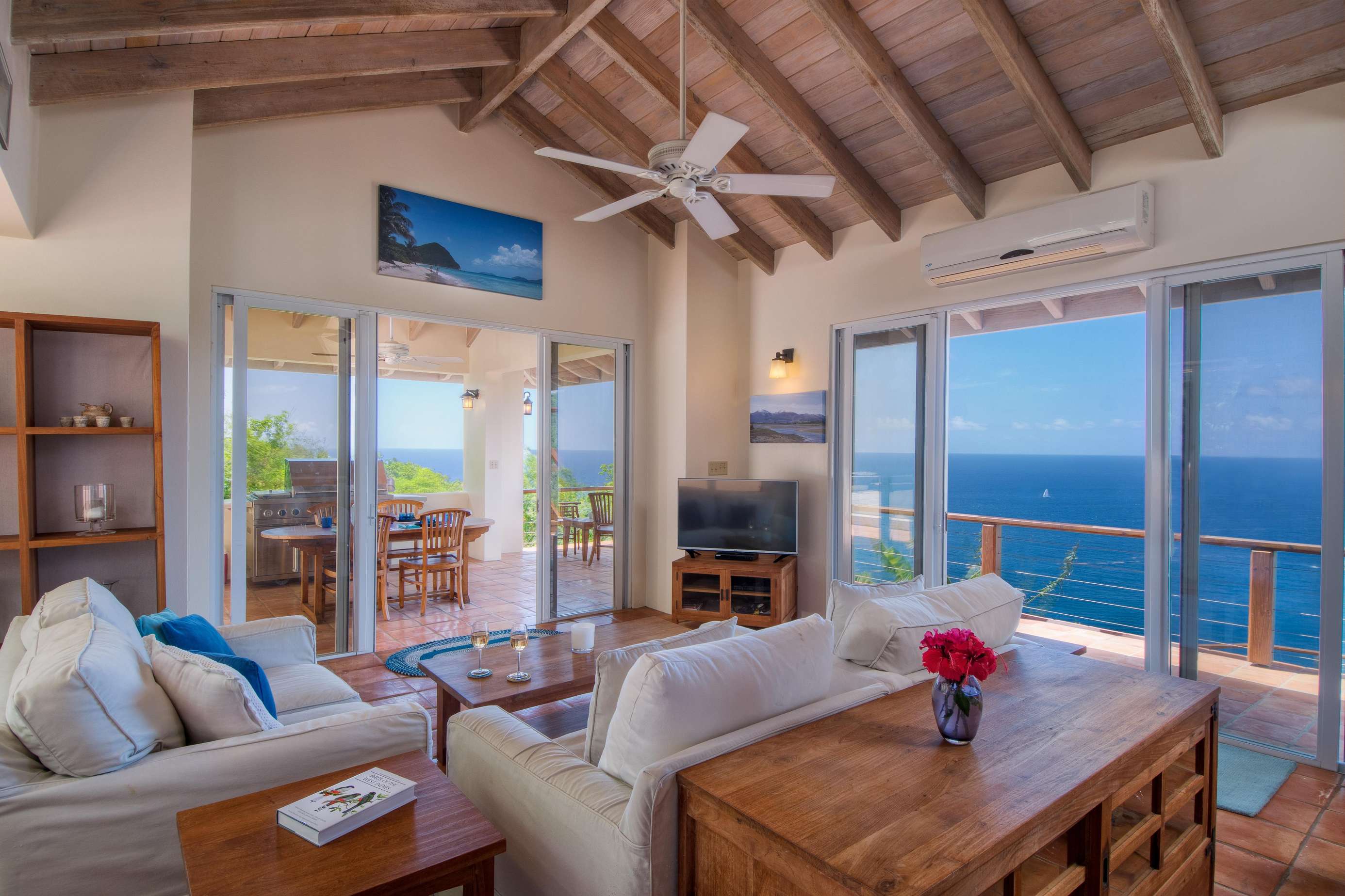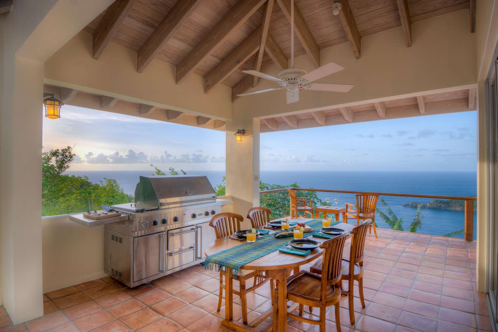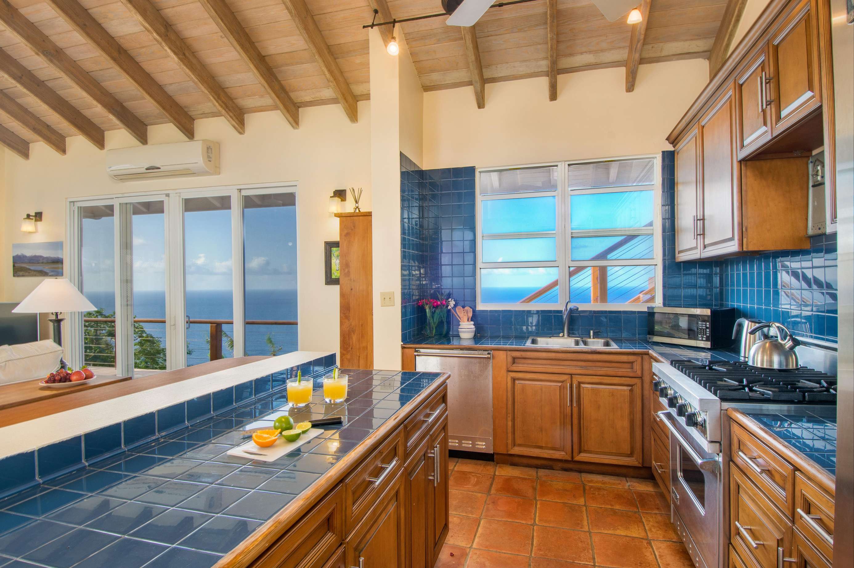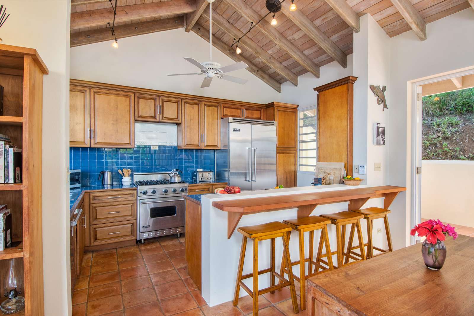 Whale Watch starts as it means to go on, as you enter through large wooden doors into a little courtyard with stunning ocean views. The kitchen and living room are separated by a relaxed breakfast bar (with seating for 4) where you can sit and chat whilst cooking, and the kitchen is fitted with stainless Viking appliances making cooking at the villa a pleasure. The living room is comfortably furnished with squashy sofa and arm chairs and a Roku SmartTV and local FLOW cable. The kitchen and living room have plenty of ventilation, light and air with 2 walls of sliding doors (both glass and screened) which open out onto THOSE ocean views and a beautiful covered alfresco dining area. There are also powerful Hunter ceiling fans and the option of AC.
