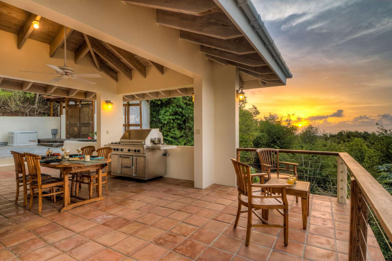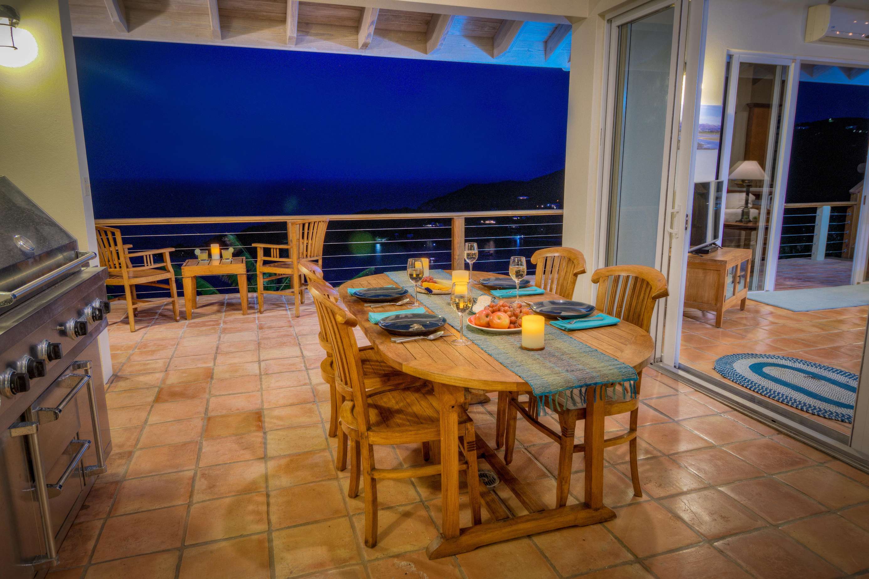 The fabulous covered al-fresco dining porch has a teak dining table and seating for 8 and a large propane grill (with rotisserie accessories and more). There is also 2 hammock chairs for chilling with a good book or cold drink.